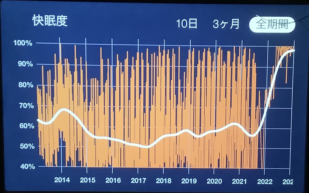 その後、それまで昼夜逆転していたのが、更に逆転して、今は夜10時頃就寝、朝9時起床しているため、快眠度が例年にないくらい高得点です。