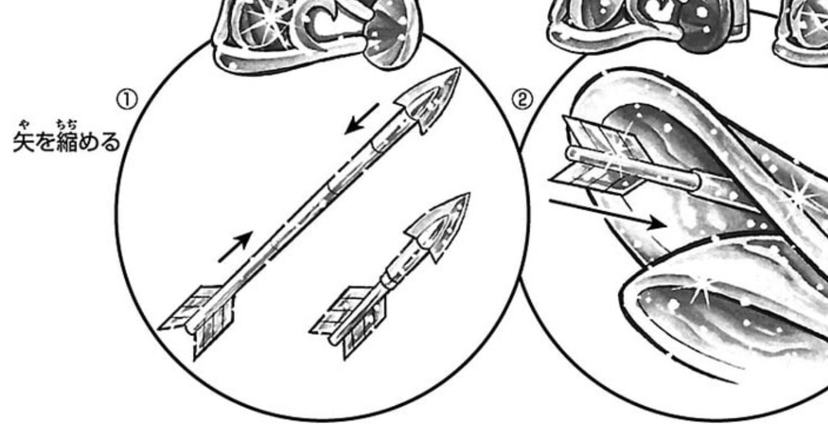 後で聖衣分解図を見たら、矢は縮めた状態で肩に格納されているらしいです。