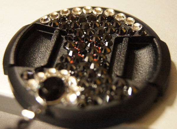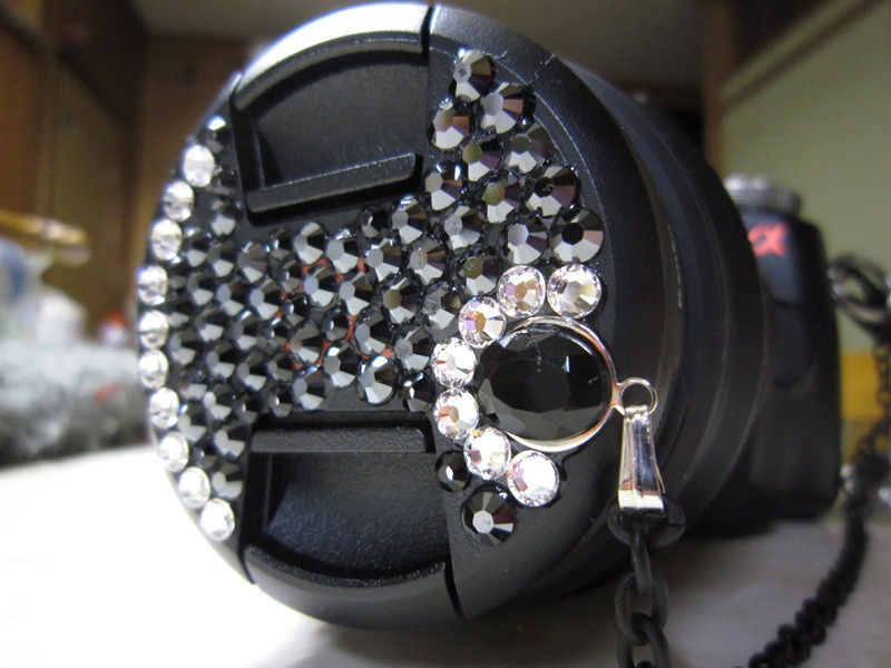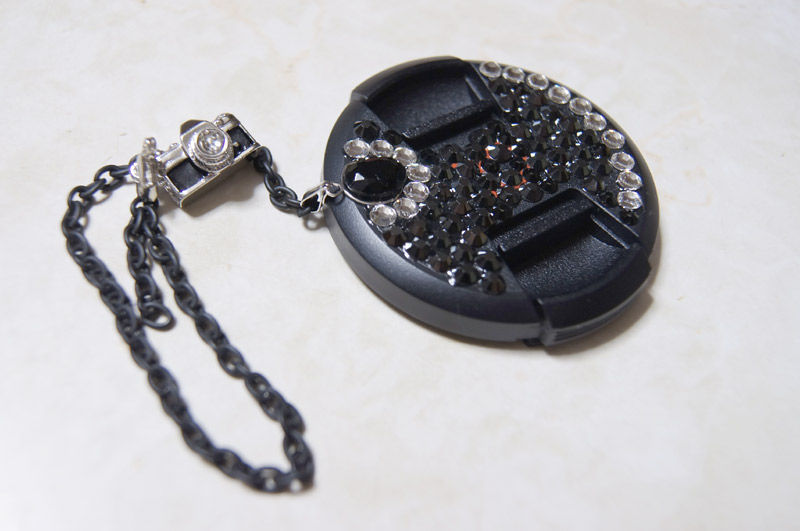 さすがに一眼のカメラキャップにピンクやリボンやフリルやスイーツは可哀想なので、黒色ベースにポイントを透明なクリスタルちっくなもので。