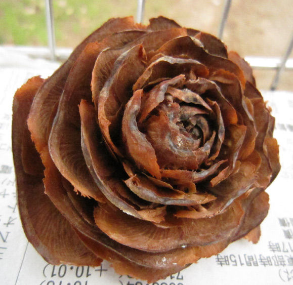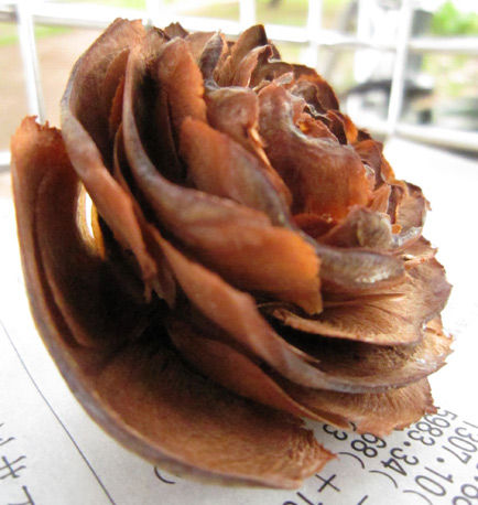そうしたら土道のところに、ひっそりと薔薇の花みたいな形をした茶色い松ぼっくりが落ちていました。