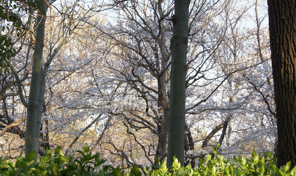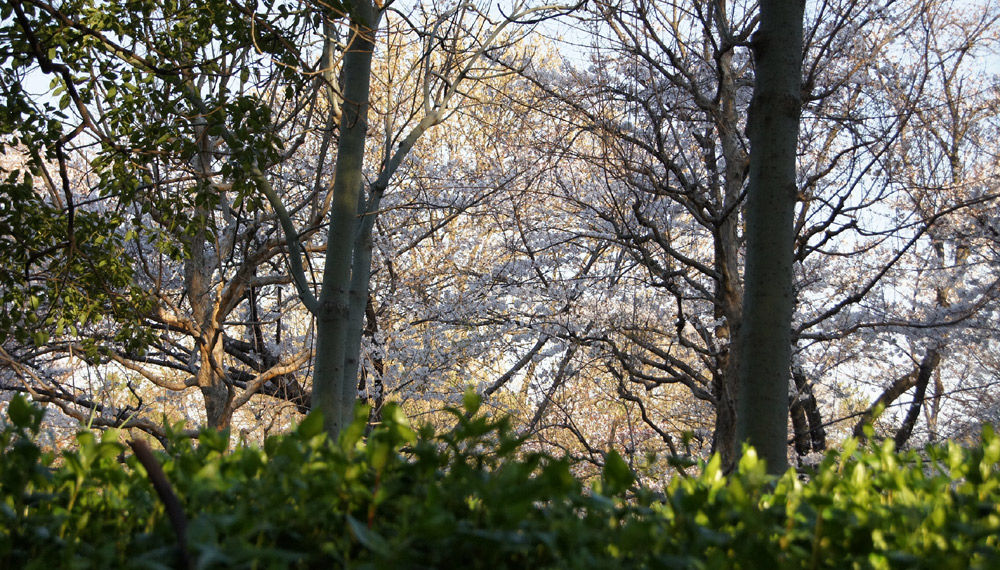 もさもさふわふわの緑の向こうに桜がたわわに咲いています